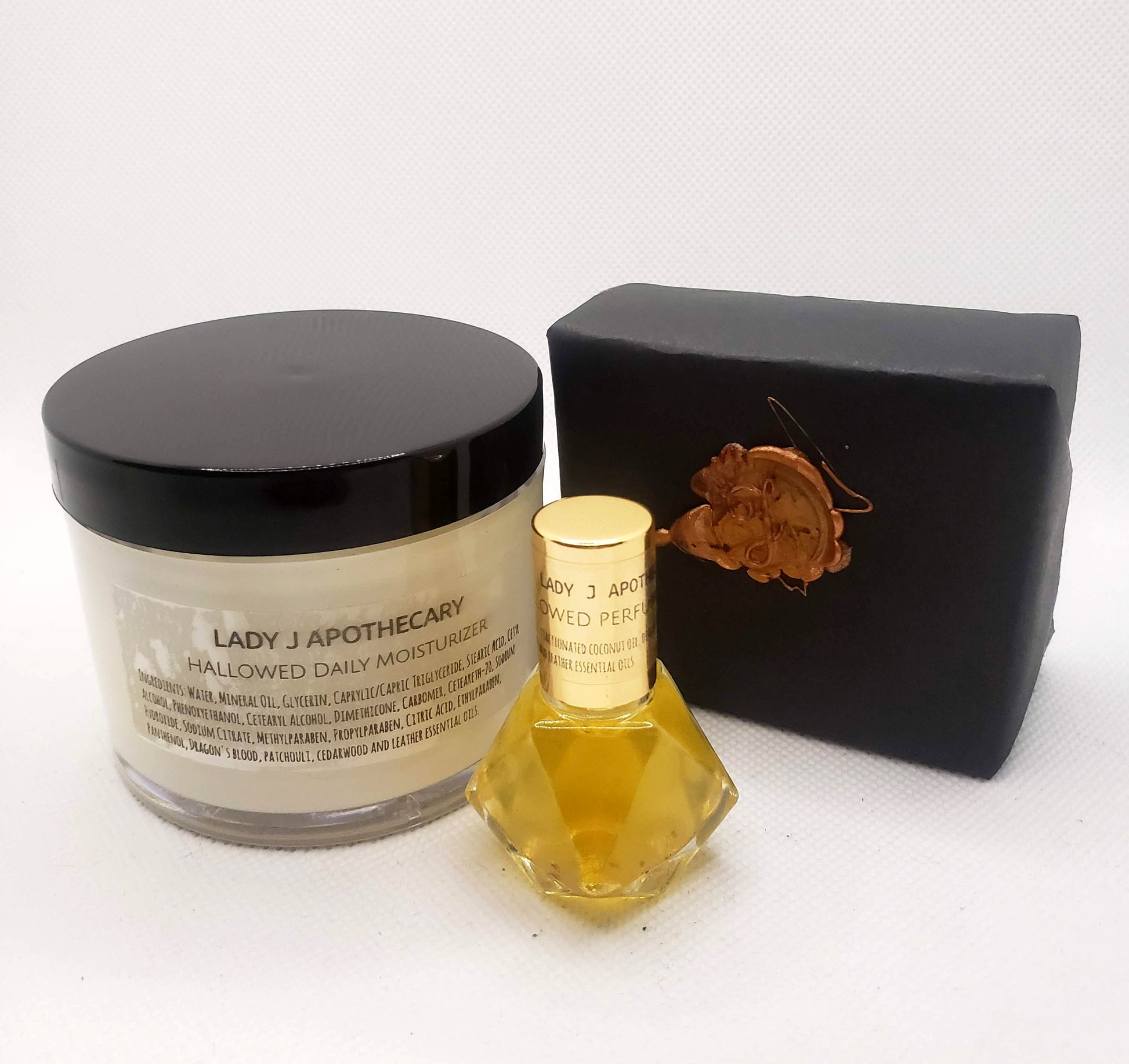 The Lady J Apothecary Perfume Bundle features one 5 oz goat milk soap bar, one 4 oz jar of daily moisturizer and one 5ml prism perfume roller. Available in three fragrances. Handmade in Chicago with love and magic.